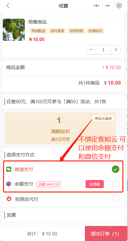 4.不绑定客如云 预售单可以用余额支付和微信支付