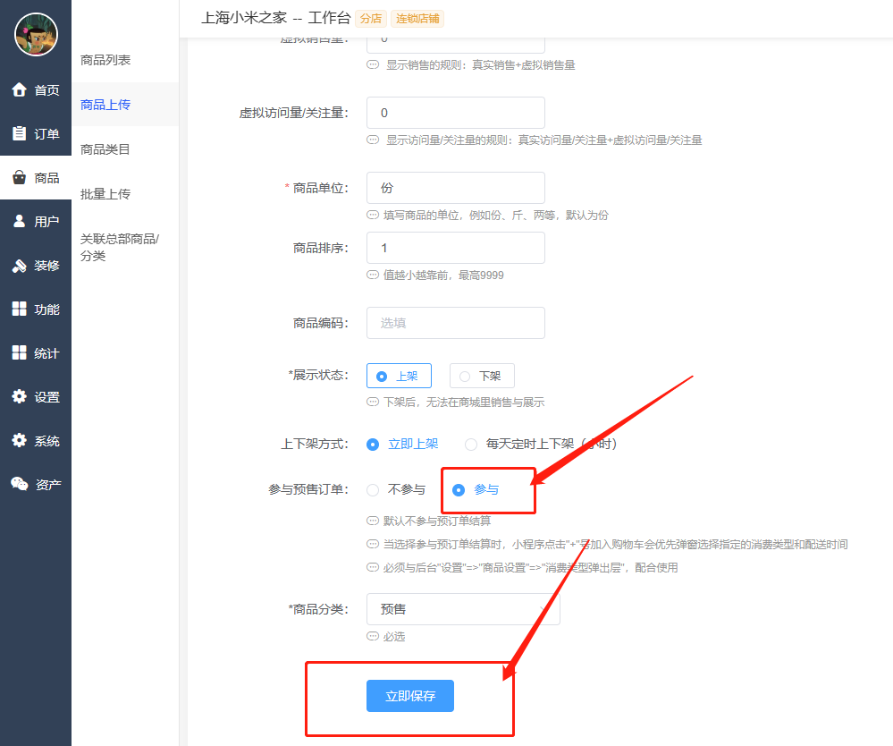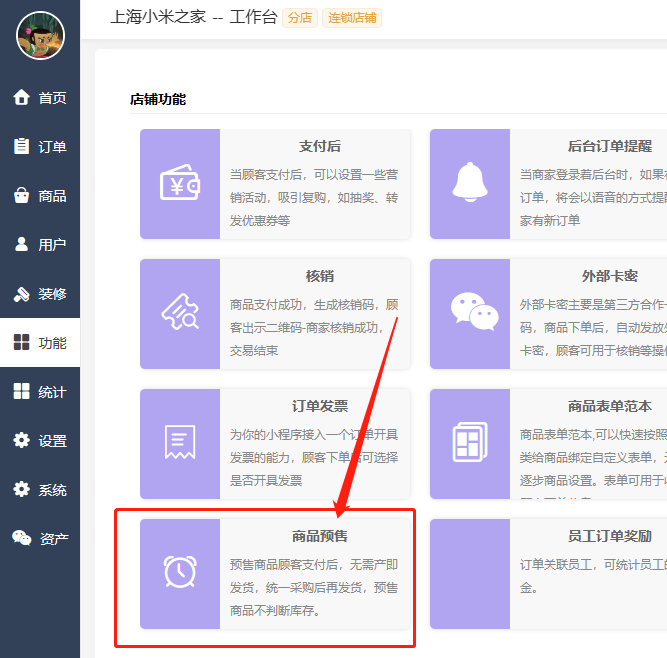 1.预售功能需要在 分店 功能 里开启