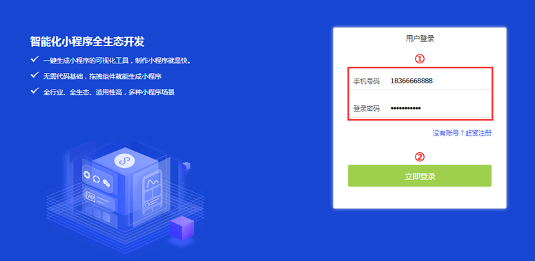 如何登陆小程序可视化制作平台? 发表于:2018-05-21 06:53:44 第一步:商家需要打开小程序可视化制作平台登录页,填写用户登录信息,注册的手机号码,登录密码。第二步:点击右下角的“立即登录”按钮,登录跳转小程序可视化制作平台的控制台页面。接下来您可以进行下一步操作了。